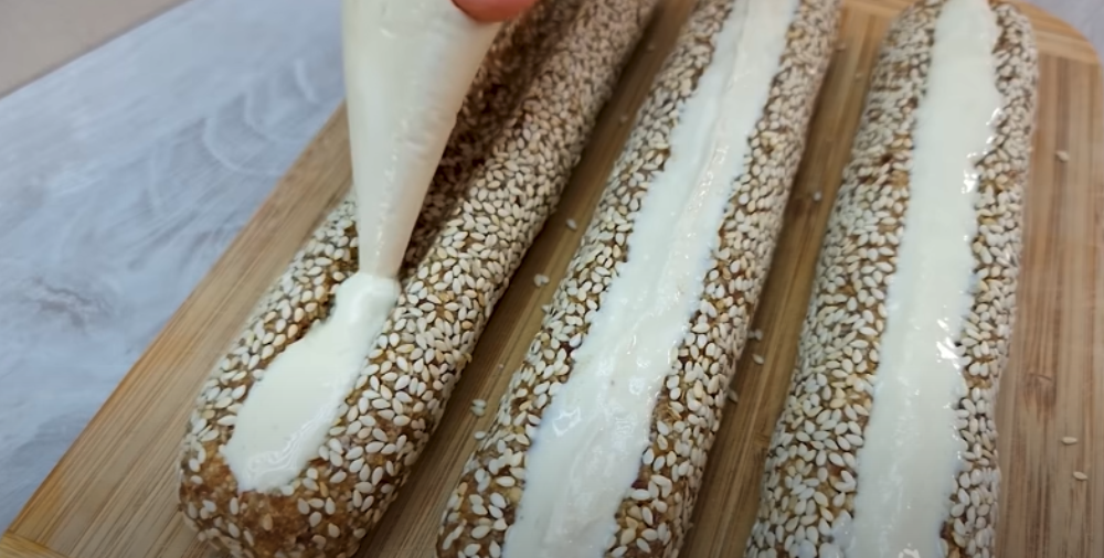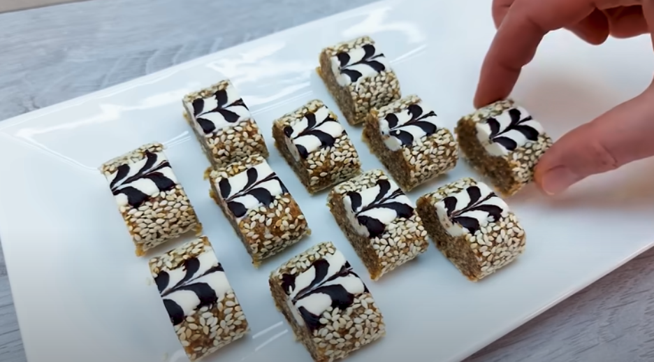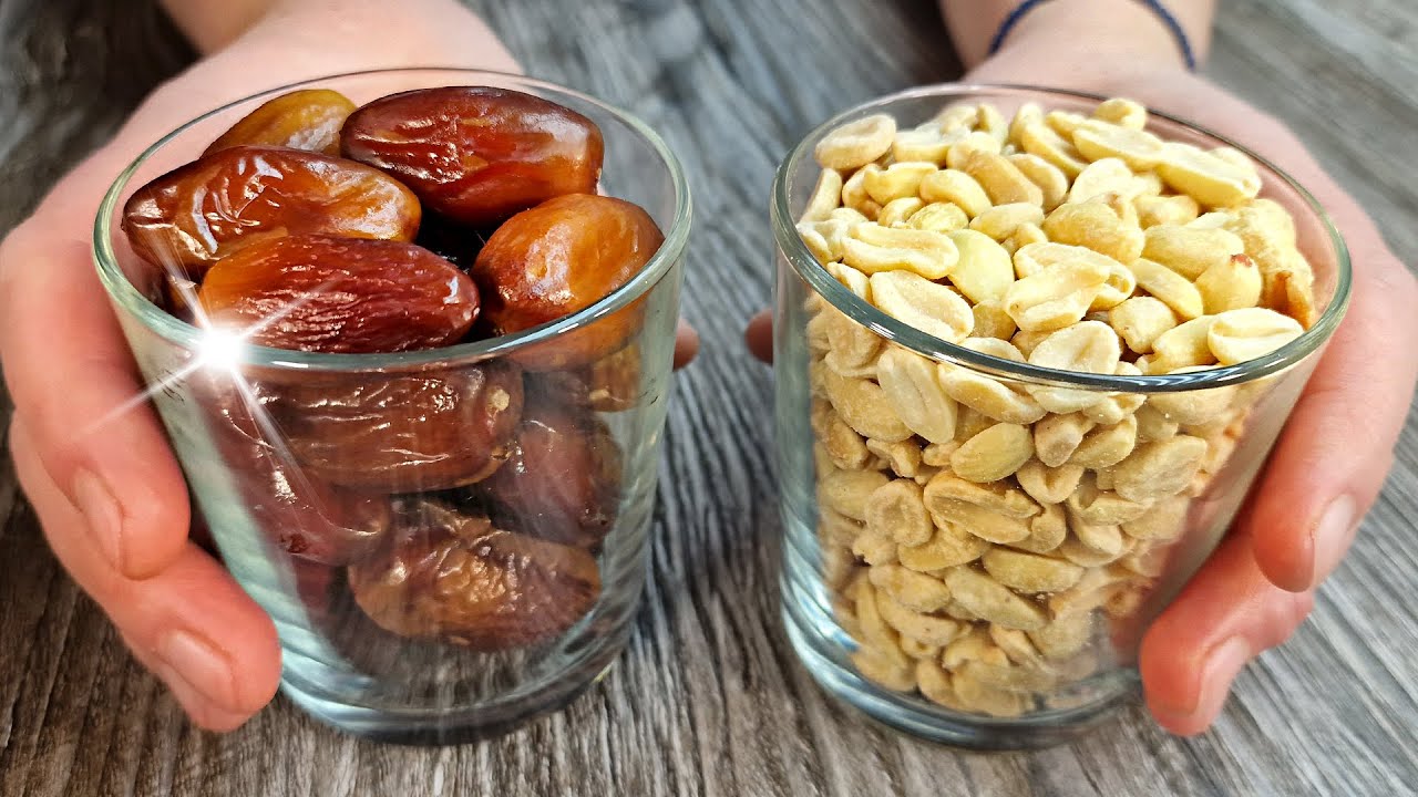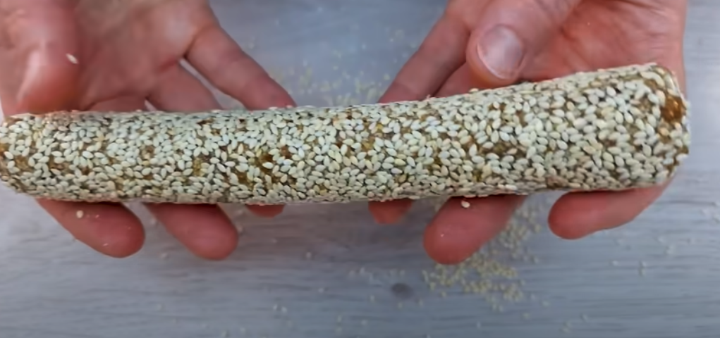 W blenderze zmiksuj orzeszki ziemne i daktyle na jednolitą masę. Jeśli nie masz blendera, możesz użyć malaksera lub dokładnie posiekać składniki i wymieszać. Smaż sezam na patelni, aż pojawi się przyjemny zapach. Weź 1/3 część masy i uformuj z niej kiełbasę, a następnie obtocz ją w sezamie.
