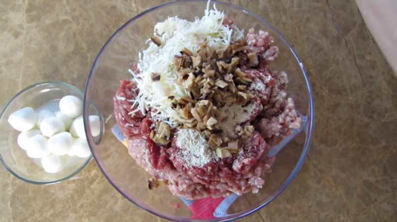 Mięso połącz w misce, dodaj sól i pieprz. Posiekaj pieczarki, zetrzyj ser (najlepiej na mniejszych oczkach). Do miski dodaj pokrojone składniki oraz dorzuć pietruszkę. Całość wymieszaj.