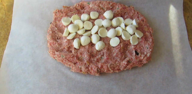 Masę rozłóż na pergaminie w kształcie prostokąta. Na prostokąt nałóż plastry mozzarelli. Całość zwiń, formując ciasny rulon.