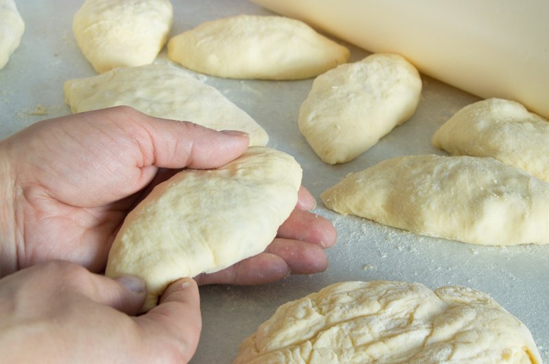 Ciasto wyjąć z miski, posypać mąką i rozgnieść na stolnicy lub blacie roboczym oprószonym mąką. Uformować niewielkie kulki. Przykryć ręcznikiem lub bawełnianą ściereczką. Z kulek formować kolejno podłużne bułeczki o grubości ok. 0,5 cm.