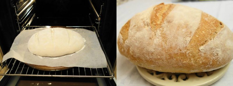 Następnie za pomocą noża pokrój ciasto na trzy części i ułóż je na blasze do pieczenia. Blachę z ciastem umieść na środku piekarnika. Na wierzchu umieścić kolejną formę. Piecz chleb przez 45 minut, a następnie wyjmij go z piekarnika i pozostaw do ostygnięcia na drucianej podstawce. Będziesz mógł cieszyć się chlebem z rodziną i przyjaciółmi.