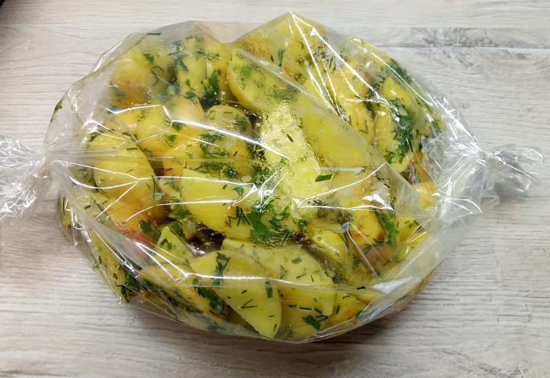 Krok 3 – Całość przełóż do rękawa i wstaw do nagrzanego do 200 stopni piekarnika. Piecz przez około 40-60 minut do miękkości ziemniaków. Na 10 minut przed wyjęciem warto rozciąć folię, by uzyskać złocistą, chrupiącą skórkę.