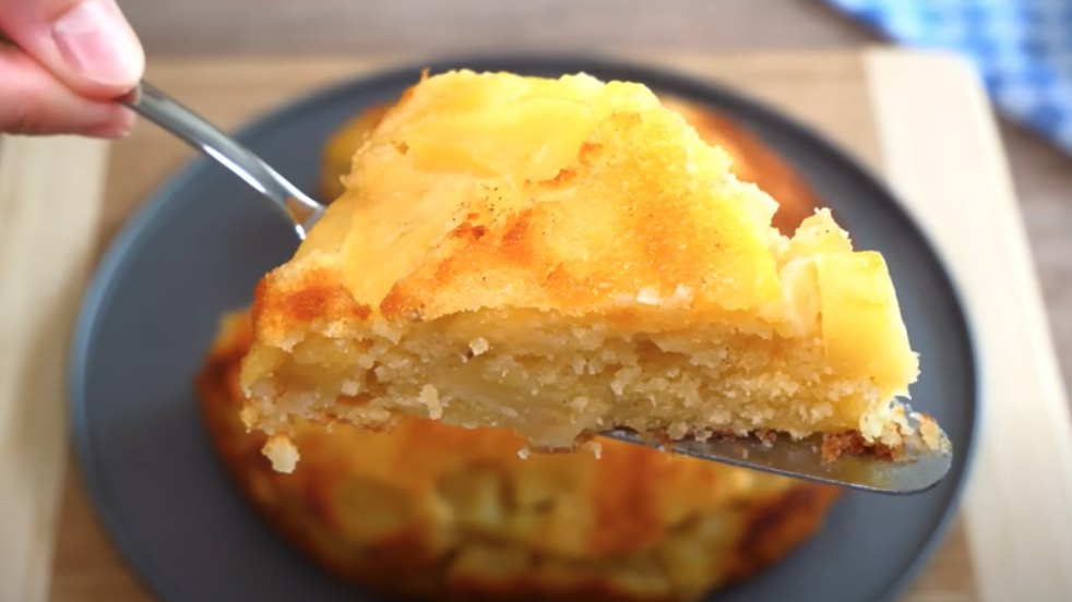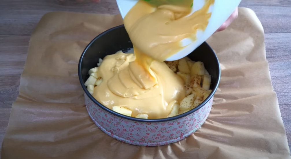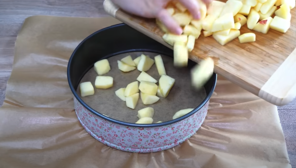 Obierz 3 jabłka i pokrój na kawałki o wielkości około 3 cm. Wyłóż formę do pieczenia pergaminem i posmaruj tłuszczem. Ułóż kawałki jabłek na dnie formy. Posyp jabłka 3 łyżkami cukru i cynamonem. Wylej ciasto na jabłka w formie. Piecz w nagrzanym piekarniku w temperaturze 180°C przez 35 minut. Po upieczeniu odwróć ciasto na talerz, aby jabłka były na wierzchu.