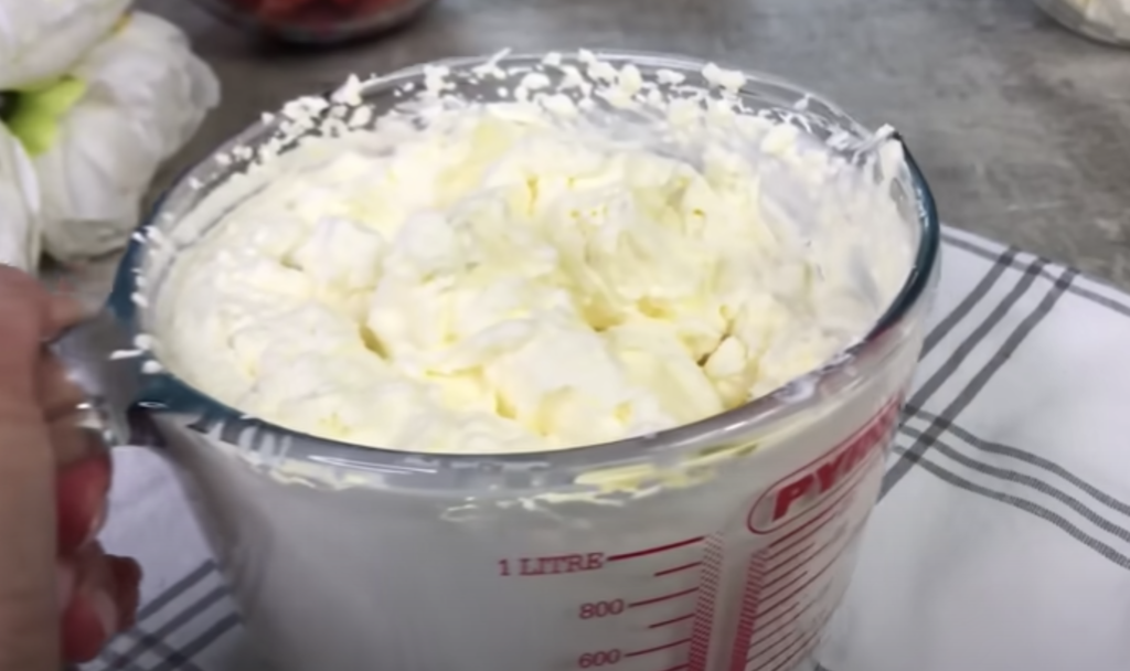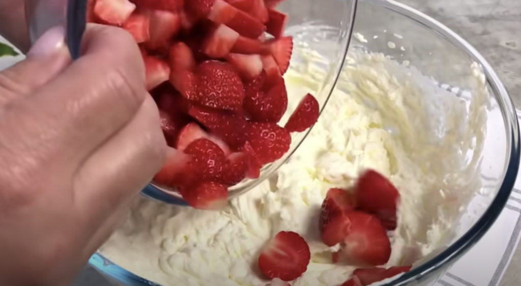 W tym czasie obierz i umyj truskawki. Dodaj truskawki do śmietany, gdy skończysz.