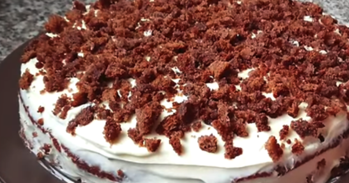 Wystarczy dokładnie wymieszać śmietanę i cukier puder. Ciasto kroimy na pół i przekładamy kremem. Warto też nałożyć krem na boki i wierzch ciasta. Ciasto można dodatkowo dowolnie ozdobić np. wiórkami czekolady.