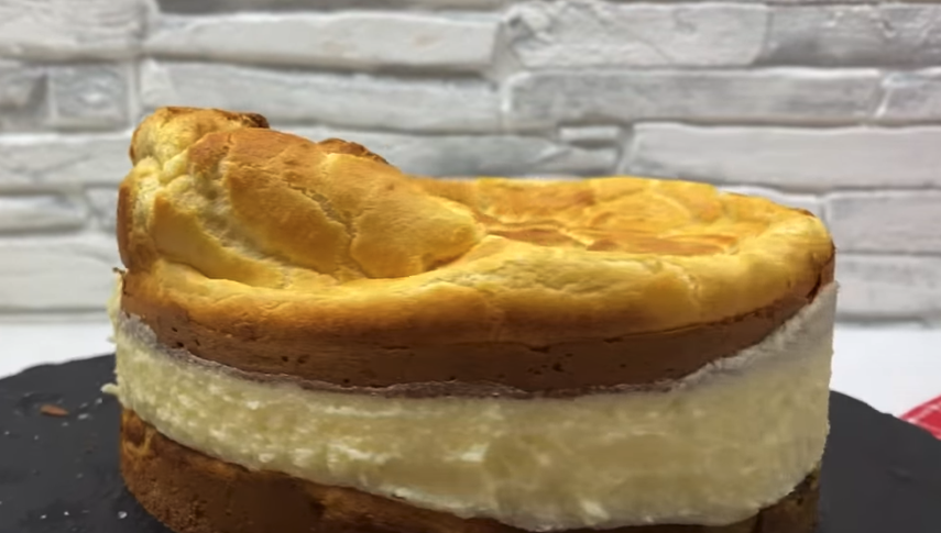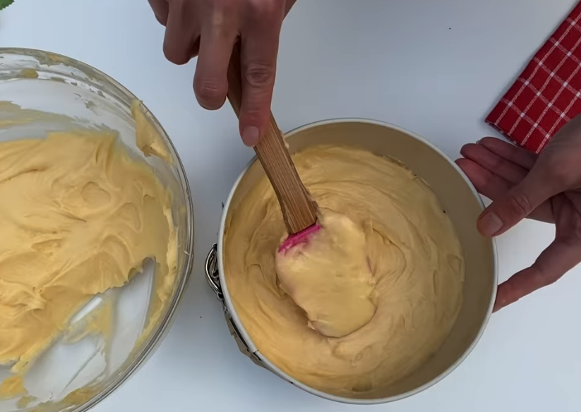 W innym garnku zagotuj mleko z 120 g cukru i 60 g skrobi kukurydzianej, stale mieszając, aż masa zgęstnieje. Po ostudzeniu, dodaj stopniowo 4 jajka, 160 g masła i 5 g cukru waniliowego, ubijając na gładką masę. Rozłóż połowę ciasta w formie o średnicy 18 cm i piecz w 200°C przez 20-25 minut. Powtórz z drugą połową ciasta.