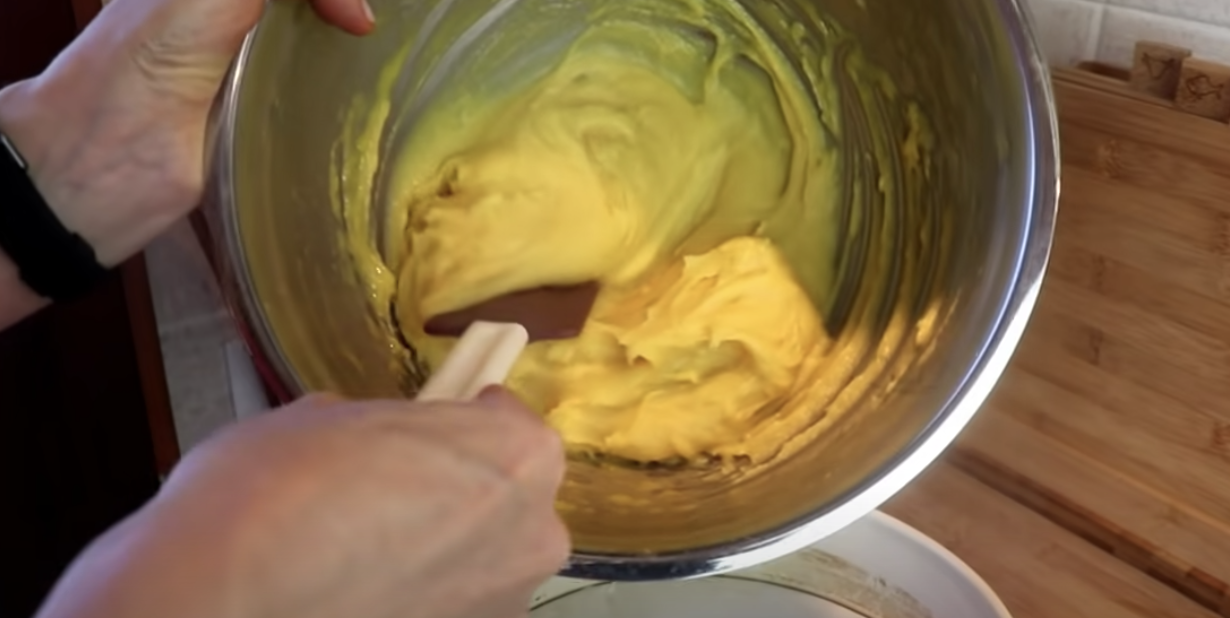 Wymieszaj masę, aż będzie gładka. Umieść połowę ciasta w formie wyłożonej papierem pergaminowym. Piecz ciasto przez 20 minut w temperaturze 200°C. Pozostaw ciasto do ostygnięcia, a następnie upiecz drugą połowę w ten sam sposób. Następnie przygotuj krem.