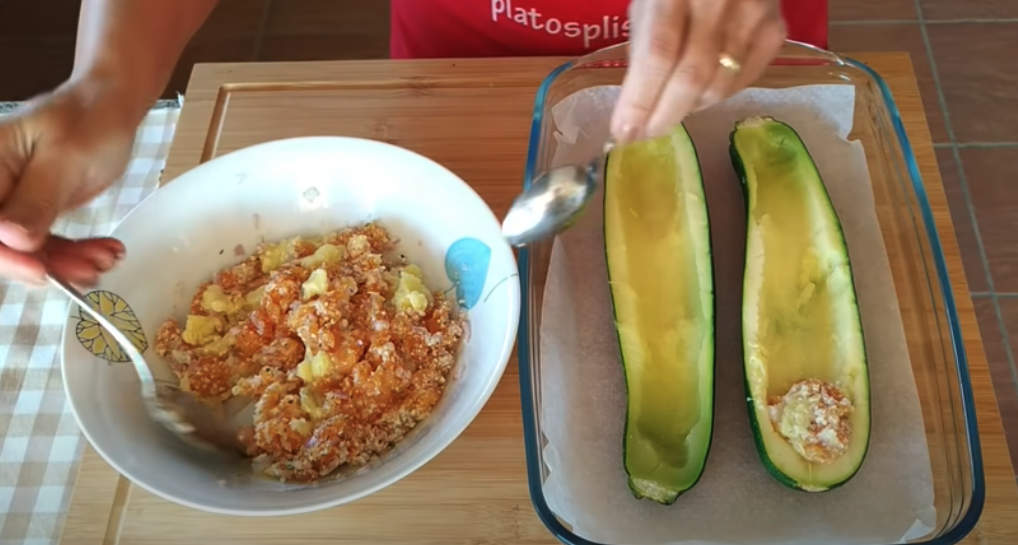 Cukinię umyj, obierz i pokrój w cienkie plastry. Pierś z kurczaka umyj, osusz i pokrój w małe kawałki. Cebulę obierz i drobno posiekaj. Na patelni rozgrzej 1 łyżkę oliwy z oliwek. Dodaj posiekaną cebulę i smaż, aż stanie się przezroczysta. Dodaj kawałki kurczaka, dopraw solą i pieprzem, smaż aż kurczak będzie złocisty i usmażony.