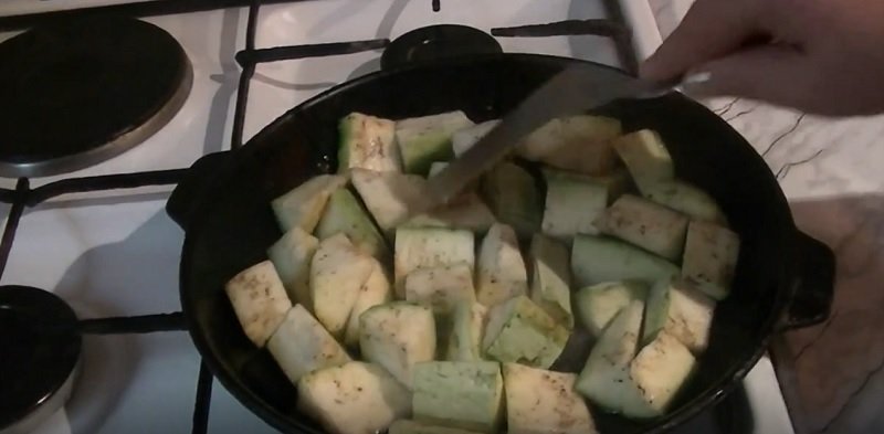 Cukinię myjemy, obieramy ze skórki i pozbywamy się nasion. Następnie kroimy je w sporą kostkę. Na patelni rozgrzewamy olej. Wrzucamy pokrojoną cukinię i przesmażamy z każdej strony na złocisty kolor. Należy uważać, by warzywo się nie rozpadło.