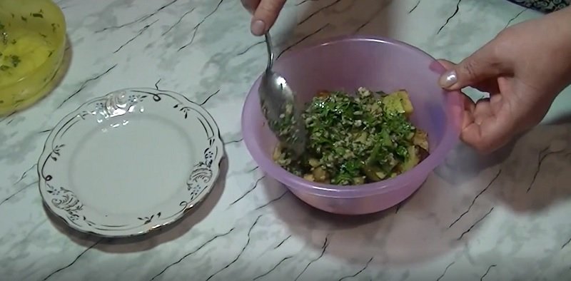Usmażone kawałki przekładamy do naczynia, w którym będziemy serwować danie. Czosnek obieramy i przeciskamy przez praskę. Natkę pietruszki myjemy i drobniutko siekamy. Rozdrabniamy orzechy. Łączymy wszystkie składniki w miseczce, następnie dodajemy olej i solimy do smaku. Łączymy dressing z usmażoną cukinią i wszystko dokładnie mieszamy.
