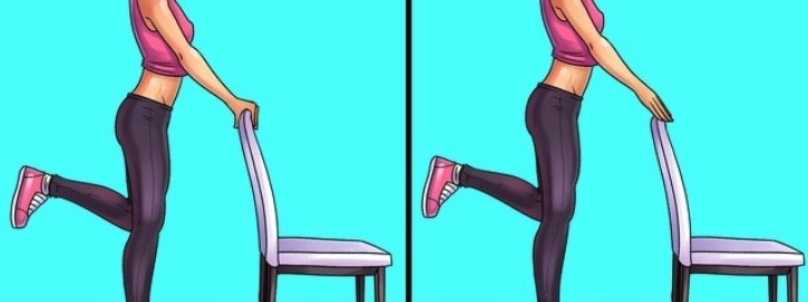 Chwyć obiema rękami oparcie krzesła. Podnieś jedną nogę do kolana, tak aby znalazła się pod kątem prostym w stosunku do łydki. Powoli unieś kostkę jednej nogi i przenieś cały ciężar ciała na stopy.