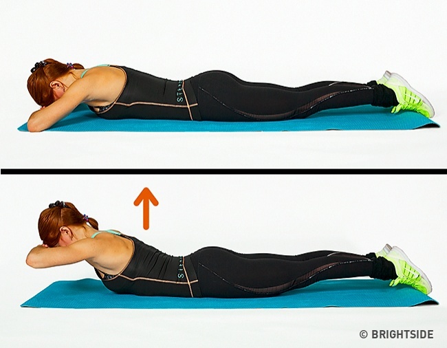 Połóż się wygodnie na brzuchu i zegnij ręce pod twarzą. Następnie unieś górną część ciała tak wysoko, na ile pozwoli ci twoje ciało. Wytrzymaj tak przez kilka sekund i powoli opuść tułów. W ten sposób wzmocnisz swój kręgosłup.