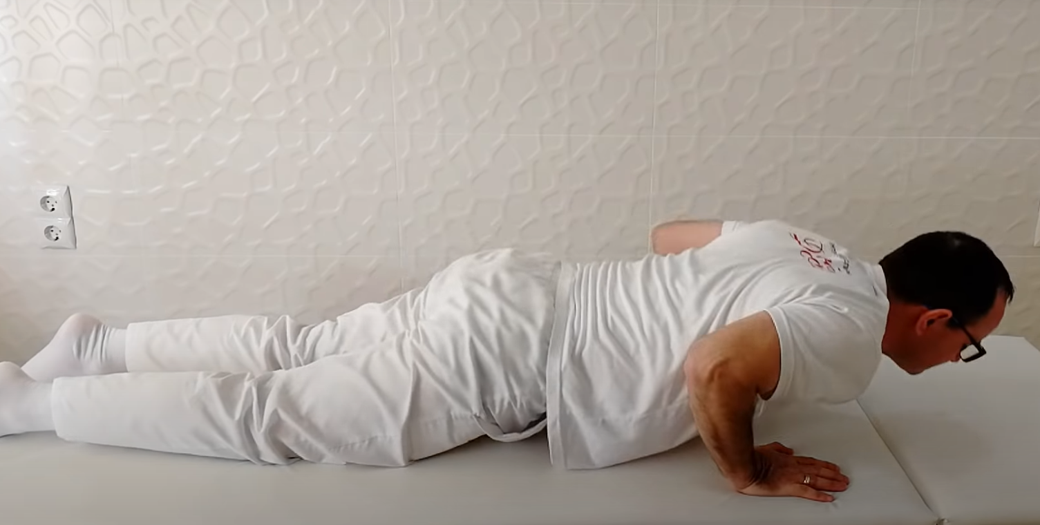 Połóż brzuch na ziemi. Dłonie powinny znajdować się na poziomie podłogi. Przesuwamy klatkę piersiową w kierunku maty. Następnie przyciągamy pośladki w kierunku pięt. Można też wykonać to ćwiczenie w uproszczonej formie.