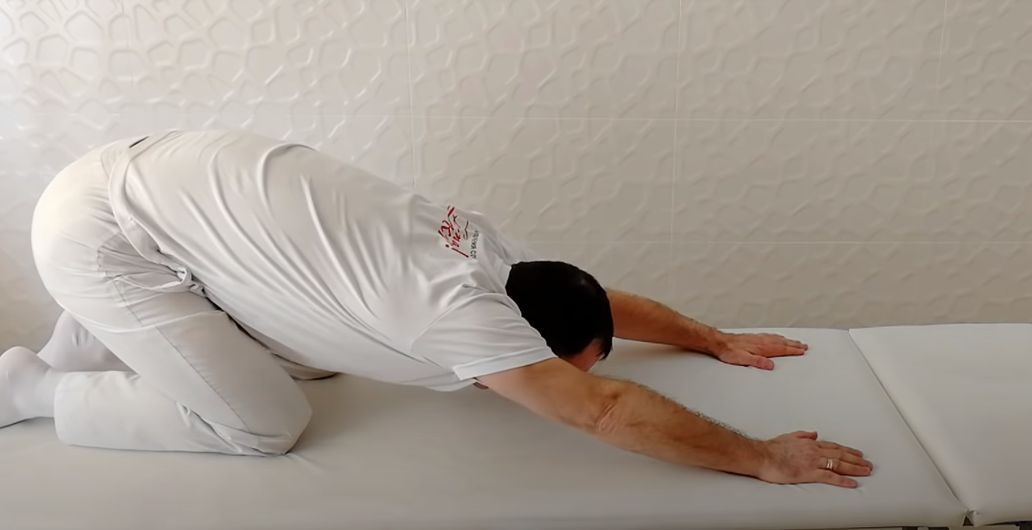 Przyciągnij przedramiona do pięt, a następnie napnij kręgosłup. Przy pierwszych dwóch powtórzeniach możesz odczuwać dyskomfort i ból. Z czasem powinno się to jednak zmniejszyć. Powtórz ćwiczenie 15-20 razy. Wykonaj 15-20 powtórzeń. Jeśli ból się nasila, należy przerwać ćwiczenie.