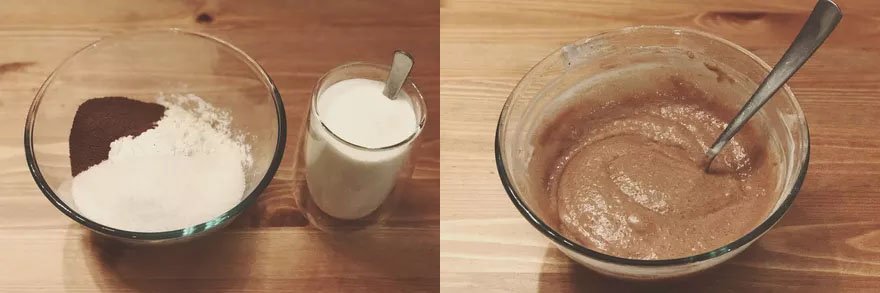 Do mąki wsypujemy kakao i cukier. Kefir mieszany z sodą oczyszczoną. Wlewamy kefir do sypkich składników i dokładnie mieszamy wszystkie składniki.
