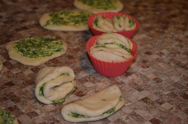 Gdy ciasto wyrośnie, na blacie lub stolnicy posypanej mąką uformuj z niego długi wałek, a następnie podziel nożem na małe, płaskie fragmenty. Z każdego z fragmentów uformuj koło. Każde z nich posmaruj porcją ziołowego masła.