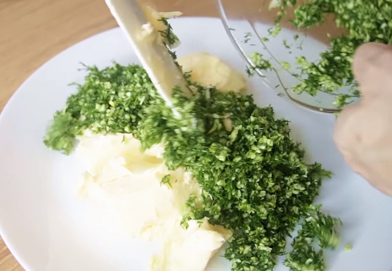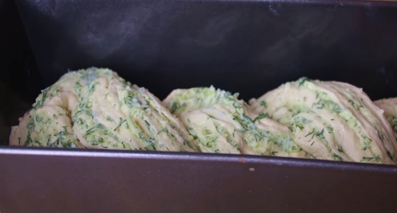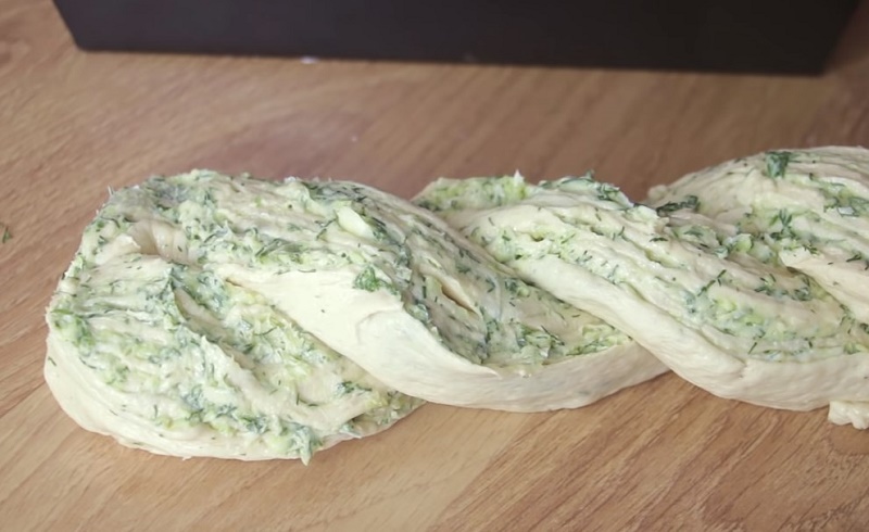 Po upływie około godziny wyjmujemy ciasto z lodówki i rozwałkowujemy je na cienką warstwę. Posmarować przygotowaną wcześniej mieszanką koperkową. Z ciasta uformuj wałek, następnie przetnij go na pół wzdłuż i utwórz „warkocz”.