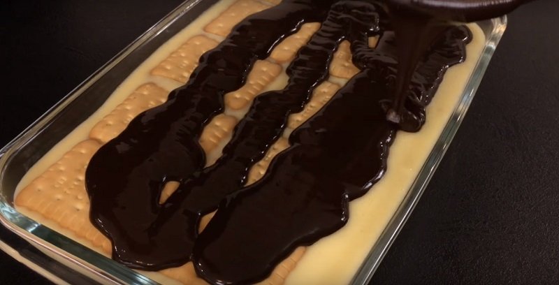 Następnie wylej na nie powstały krem i stwórz kolejną warstwę z ciastek. Proces powtarzaj tak długo, aż nie zabraknie ci herbatników lub kremu. Na sam koniec polej ciasto przygotowaną polewą i wstaw je do lodówki na kilka godzin.