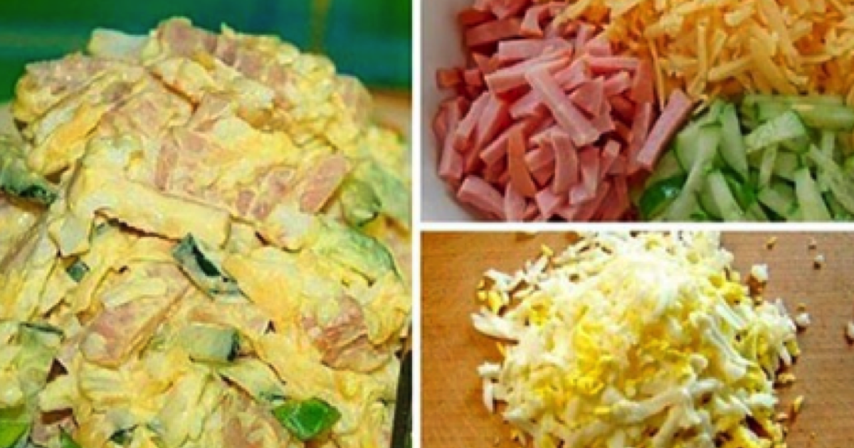 Jajka ugotuj na twardo, obierz i zetrzyj na drobne oczka. Podobnie zrób z serem. Ogórki obierz ze skóry, pokrój na cienkie plastry. Szynkę potnij w ten sam sposób, ewentualnie w drobną kostkę. Wszystkie składniki zmieszaj w misce, dodaj sól, pieprz, ząbek czosnku przeciśnięty przez praskę. Sałatkę zagęść majonezem lub jogurtem naturalnym.