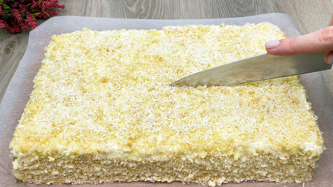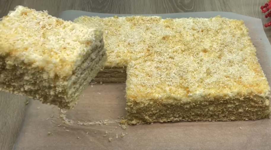 Rozsmaruj równomiernie krem na ostudzonym biszkopcie. Posyp wierzch ciasta orzechem kokosowym. Przechowuj ciasto w lodówce przez 1 godzinę przed podaniem, aby krem stężał. Wyjmij ciasto z lodówki, pokrój na kawałki i podawaj. To idealny deser na każdą okazję!