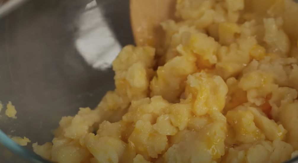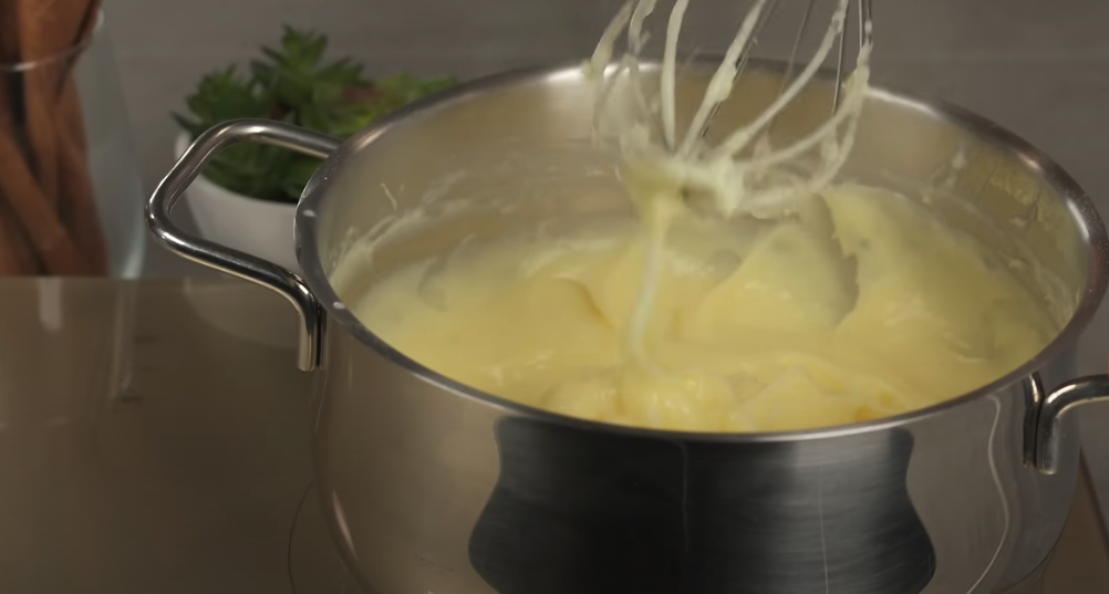 W garnku podgrzej wodę, mleko, masło, sól i cukier na małym ogniu, aż masło się rozpuści. Gdy mieszanina zacznie wrzeć, dodaj mąkę i energicznie mieszaj przez około 2 minuty, aż ciasto stanie się jednolite i zacznie odchodzić od ścianek garnka. Przełóż ciasto do miski i pozostaw do ostygnięcia na około 5 minut.