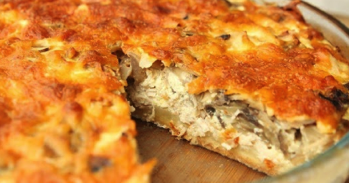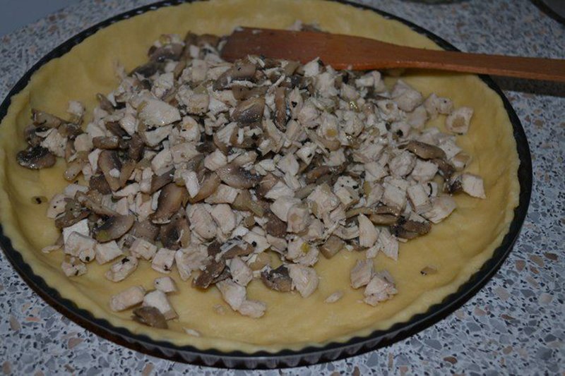 Ugotuj filet z kurczaka i pokrój w drobną kostkę. Pieczarki pokrój w plasterki, cebulę w kostkę. Podsmaż na patelni cebulę z grzybami, następnie dodaj pokrojonego kurczaka, smaż jeszcze kilka minut. Przestudź, a następnie wymieszaj z dwoma roztrzepanymi jajkami, śmietaną oraz startym na tarce żółtym serem. Dopraw solą, pieprzem i ziołami. Świetnie sprawdzi się tymianek lub gałka muszkatołowa.