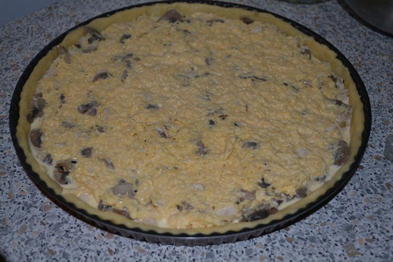 Blachę do tarty wyłóż wyjętym z lodówki ciastem, na wierzch wylej nadzienie.