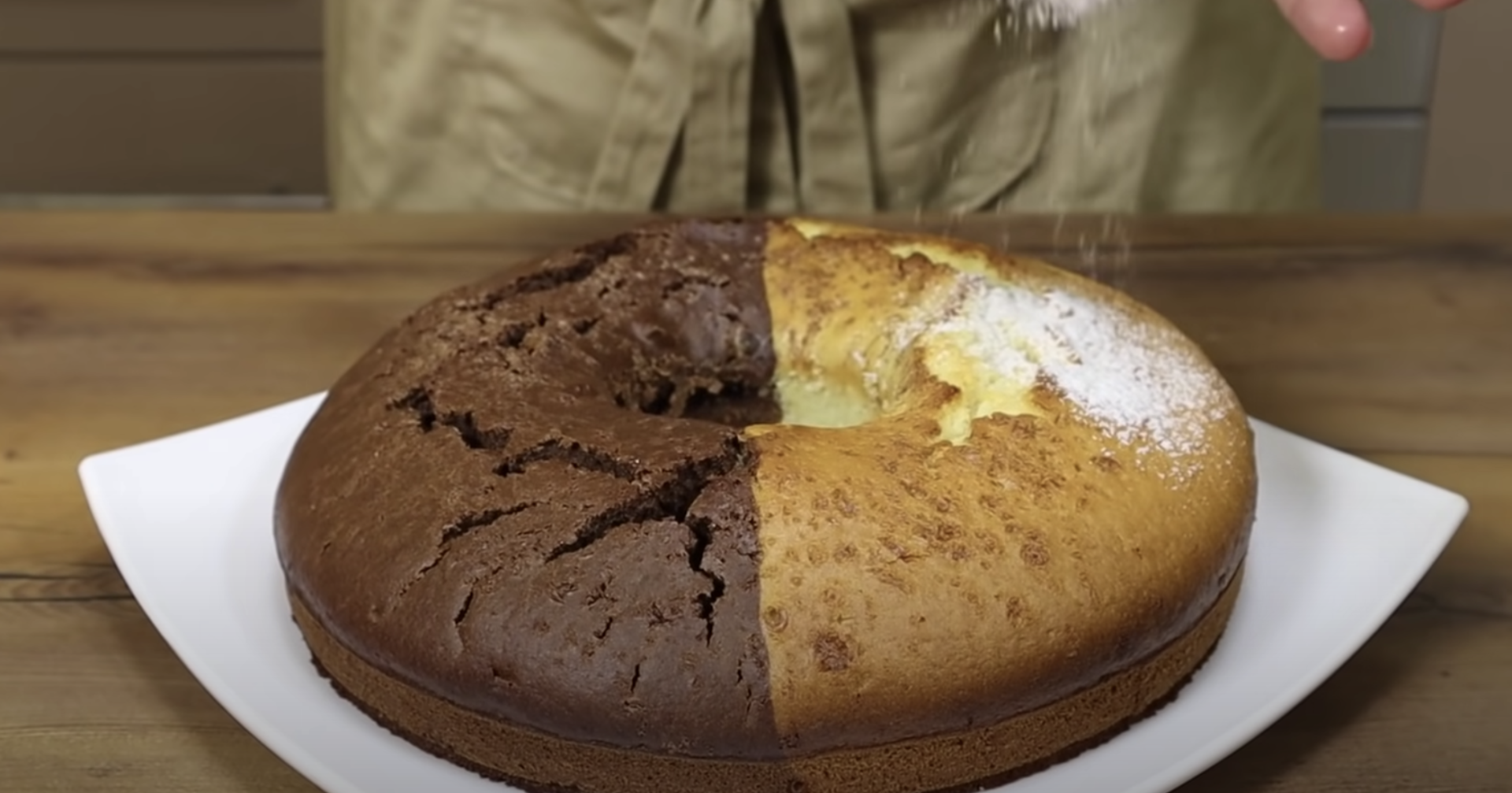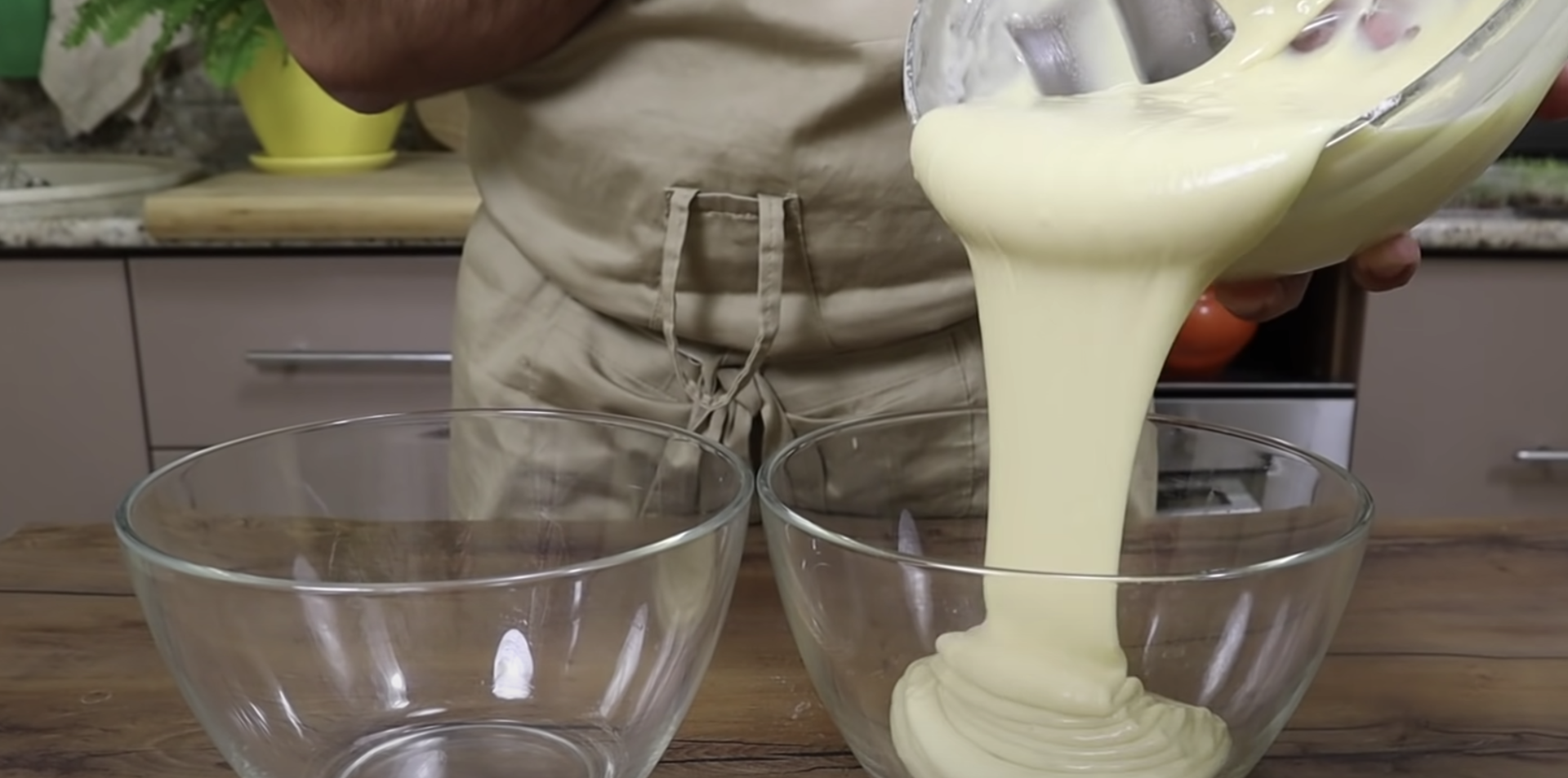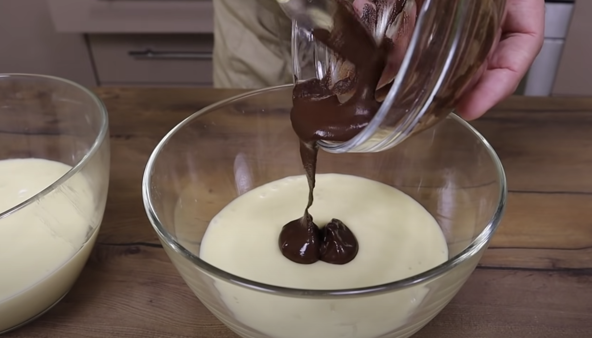 Podziel ciasto na dwie równe porcje i umieść w osobnych miskach. Połącz kakao z wodą.