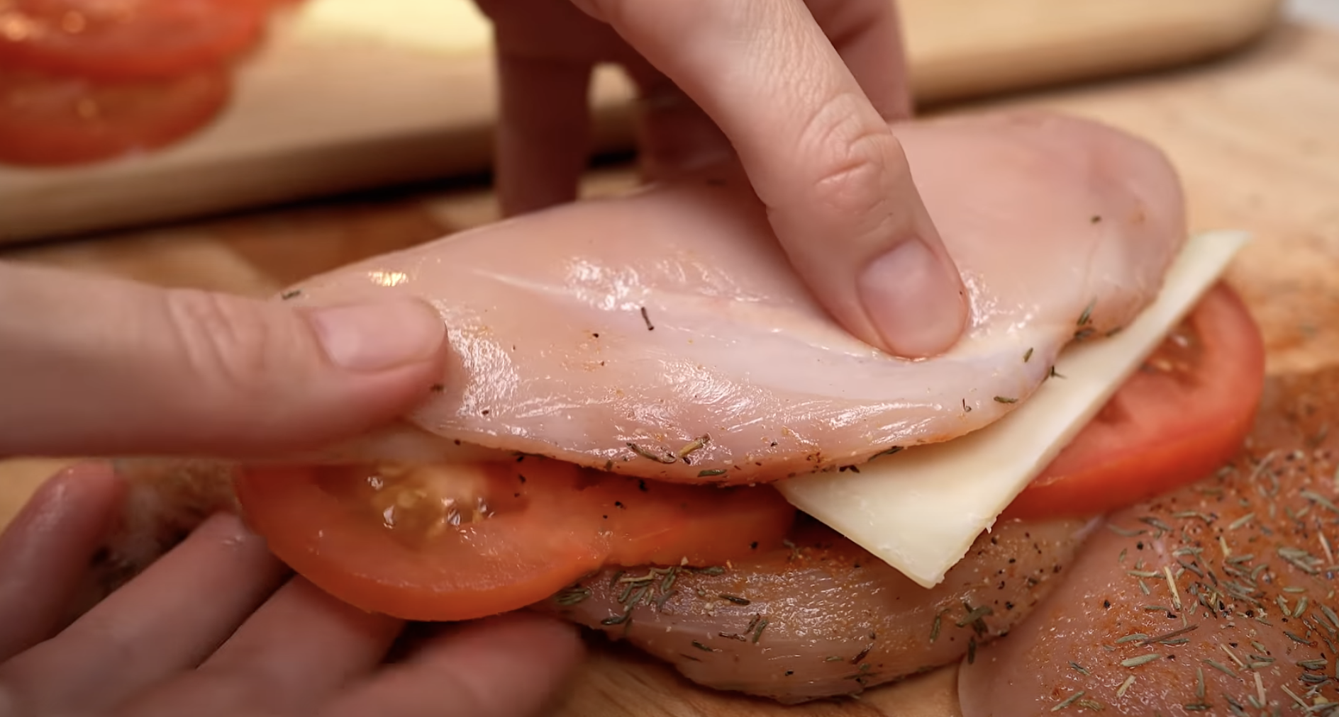 Piersi po umyciu i osuszeniu przekrawamy wzdłuż na pół. Mięso doprawić przyprawami. Pomidory kroimy w plasterki. W miseczce połączyć śmietanę i musztardę.