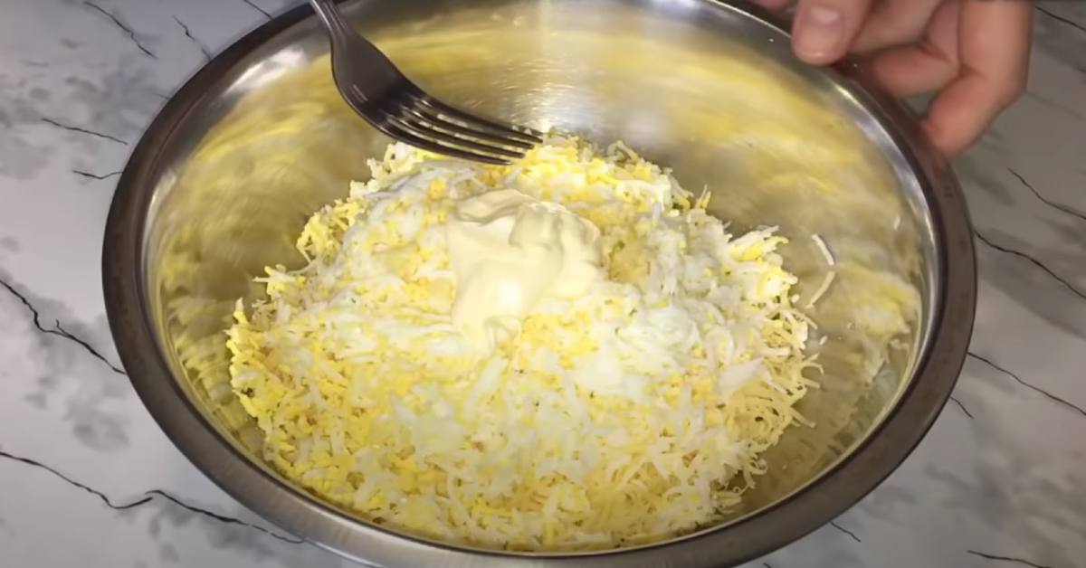 Gotujemy jajka na twardo i gdy ostygną, ścieramy je na tarce. Podobnie postępujemy z serem. Mieszamy starte produkty i doprawiamy solą i pieprzem. Dodajemy przeciśnięty przez praskę czosnek i majonez. Dokładnie mieszamy.