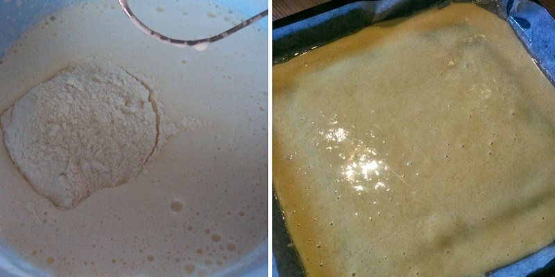 Następnie przesiej mąkę i skrobię i dodawaj stopniowo do masy stale mieszając mikserem na niskich obrotach. Blachę do pieczenia o wymiarach 20 x 30cm wyłóż pergaminem i wlej do niej przygotowane ciasto. Pamiętaj żeby ciasto było równomiernie wyłożone. Rozgrzej piekarnik do temperatury 175 stopni i piecz przez 25 min.