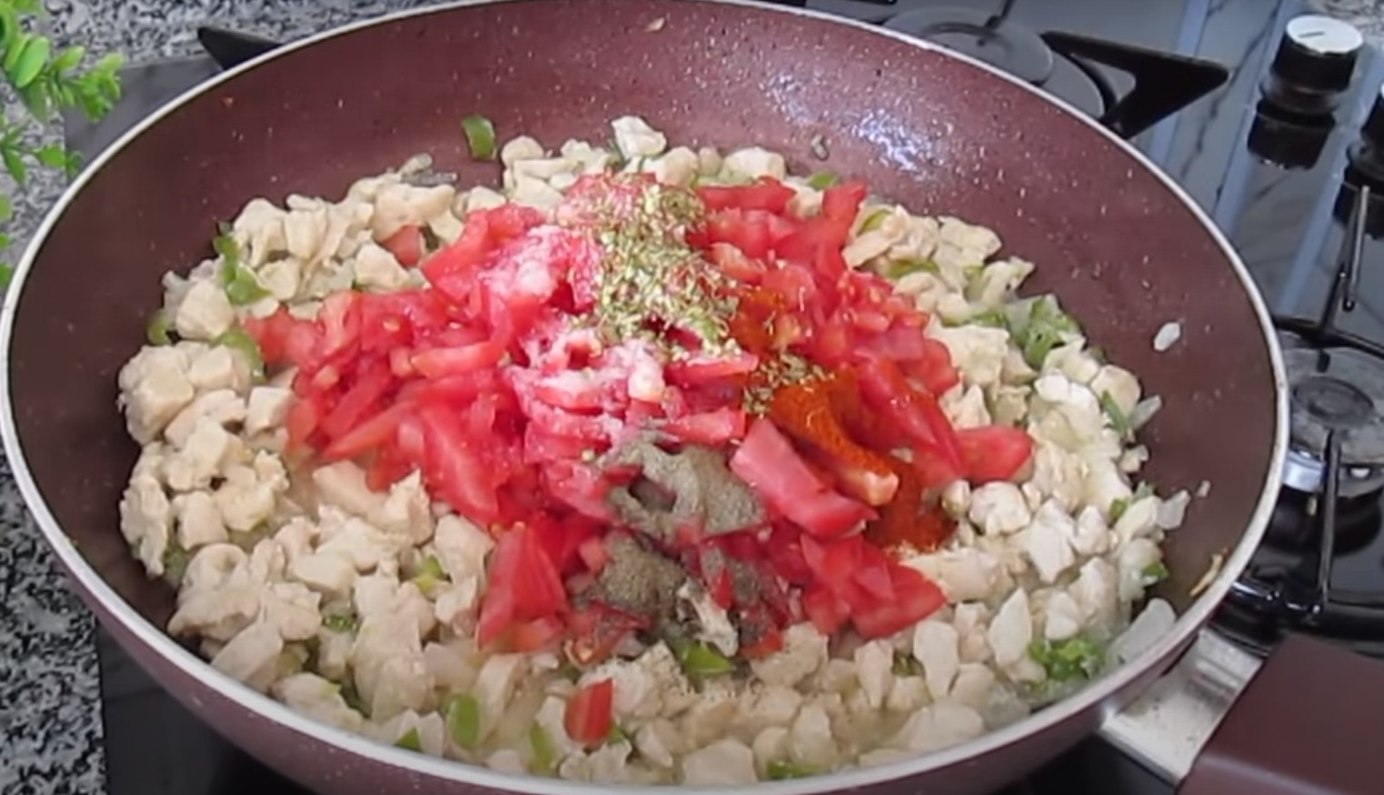 W rondlu rozgrzać niewielką ilość oleju roślinnego. Dodaj cebulę i paprykę do oleju. Kontynuuj smażenie przez kilka minut, mieszając od czasu do czasu. Wymieszać z pokrojonymi pomidorami, przyprawami i solą. Mieszać przez kilka sekund, a następnie wyłączyć ogień.