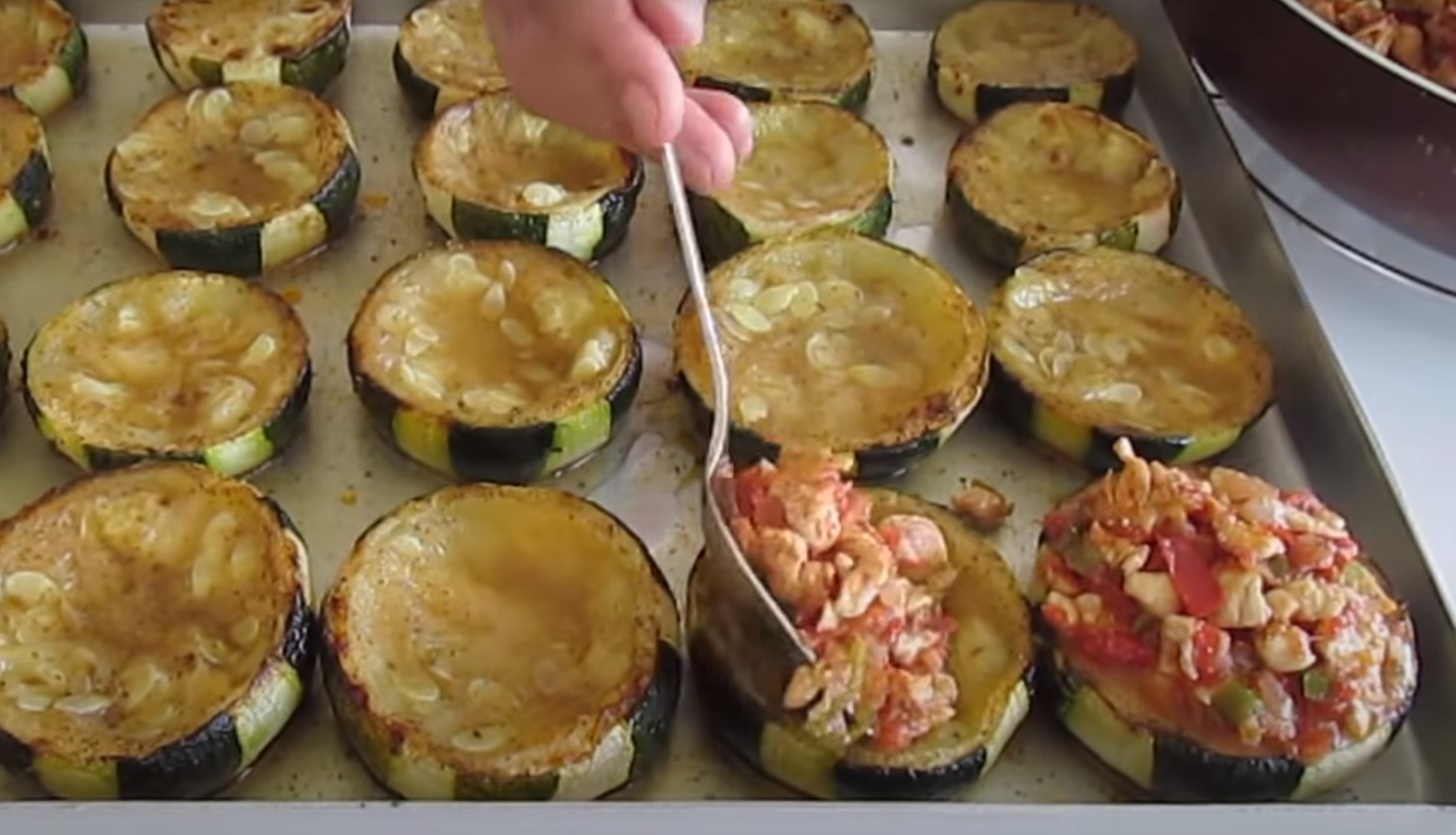 Pyszny obiad z cukinii, kurczaka i pomidorów z serem. Każdemu zasmakuje.
