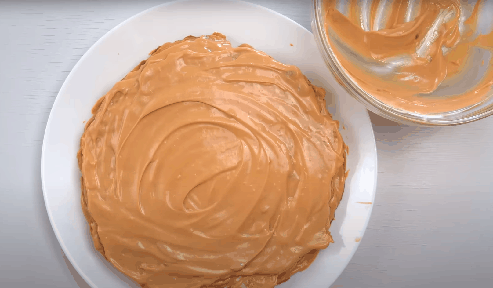 Rozgrzej suchą patelnię i połóż na niej tak przygotowany placek. Smaż go z każdej strony przez 1-2 minuty. W ten sposób usmaż wszystkie placki. Następnie przygotuj krem łącząc ze sobą śmietanę i mleko skondensowane. (Odłóż odrobinę śmietany). Przekładaj placki smarując je powstałą masa ze śmietany i mleka.