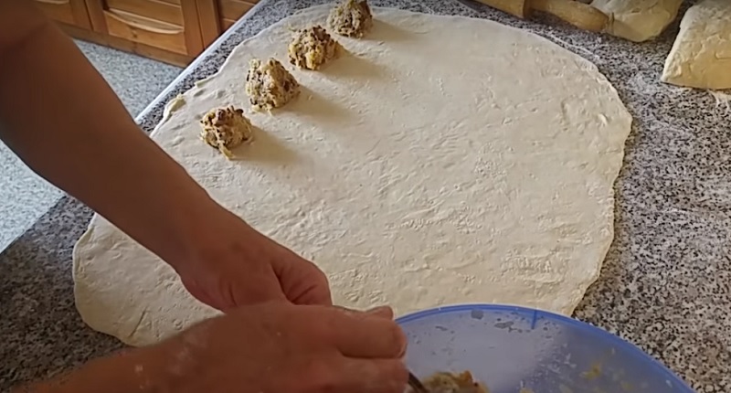 Po rozwałkowaniu ciasta na pierogi na płaskiej powierzchni posyp je mąką. Około 5-7 cm od krawędzi ciasta położyć kulki farszu.