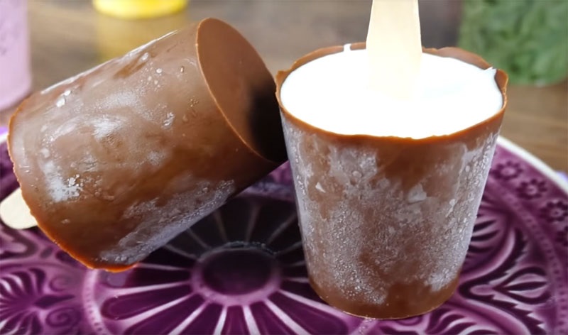 Tak przygotowane kubeczki należy umieścić na 10 minut w zamrażalniku. Następnie do kubeczków nałożyć wcześniej przygotowaną masę lodową. Do każdego kubeczka włożyć patyczek, i znów umieścić je w zamrażalniku na minimum 5 godzin.