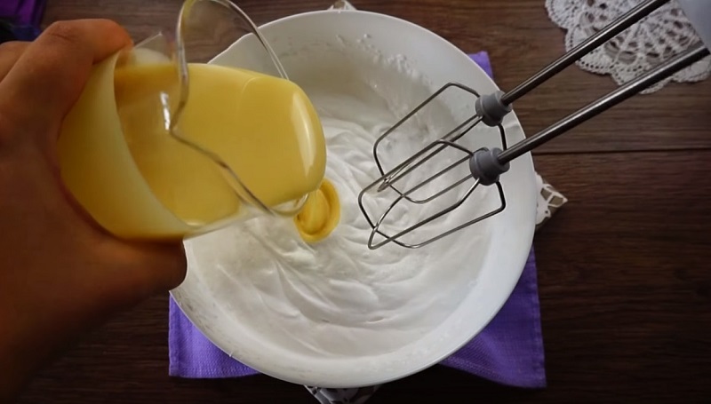 Ubić śmietankę na sztywno, w głębokim naczyniu za pomocą miksera lub trzepaczki. Powoli cały czas mieszając dodawać skondensowane mleko. Jeśli chce się by lody były mniej słodkie można użyć mniej mleka.