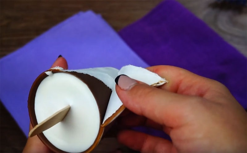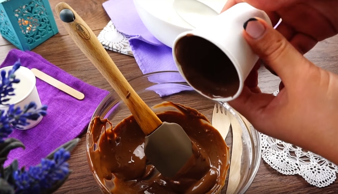 Czekoladę na polewę rozpuścić w kąpieli wodnej lub w kuchence mikrofalowej. Czekoladę po rozpuszczeniu ostrożnie umieścić na bokach i dnie papierowych kubeczków, nadmiar odlać do miski.