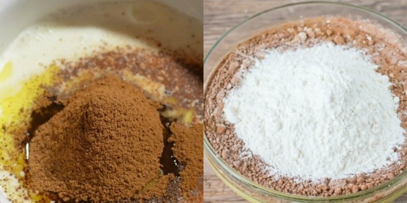 Dalej, do przygotowanej masy dodaj olej słonecznikowy, a także kakao, po czym wymieszaj mieszankę na jednolitą konsystencję. Teraz przesiej mąkę wraz z proszkiem do pieczenia i kaszą manną. Następnie należy dodać rodzynki i wymieszać ciasto.