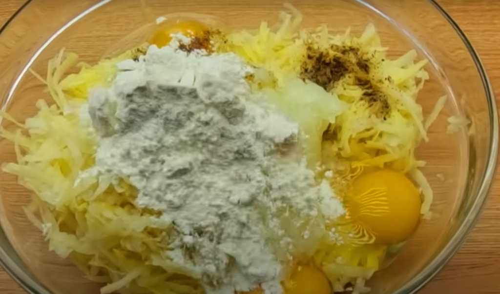 Przełóż ziemniaki do miski i odsącz je. Wymieszaj razem startą cebulę, sól i pieprz, 2-3 łyżki mąki, 3 jajka i dobrze wymieszaj.