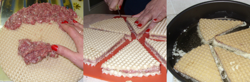 Podgrzej olej słonecznikowy na patelni. Połącz mleko z dwoma jajkami. Waflowe przekąski zamocz w mieszance i przełóż na patelnię. Smaż do momentu, aż mięso będzie ugotowane (zależy to od grubości warstwy nadzienia).
