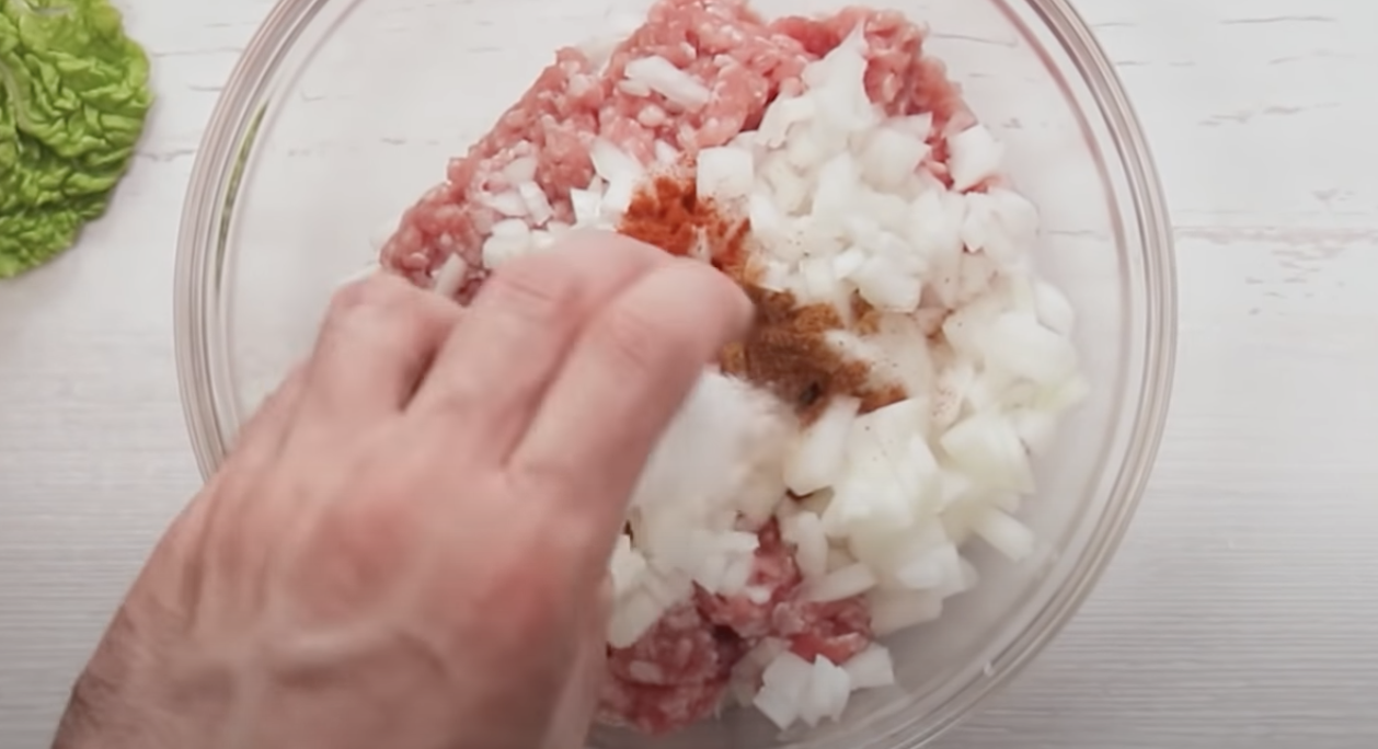 Przygotować wszystkie składniki na farsz z mielonej wołowiny. Mięso mielone i cebulę doprawić solą, pieprzem i innymi przyprawami.