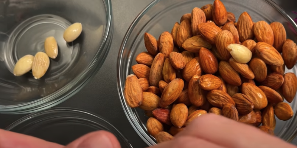 Zagotuj wodę w garnku. Dodaj migdały i gotuj przez 3 minuty, aby zmiękły. Odcedź migdały i osusz je ręcznikiem papierowym. Rozgrzej patelnię na średnim ogniu. Dodaj migdały i smaż, mieszając od czasu do czasu, aż będą lekko złociste i chrupiące. Około 5-7 minut. Odstaw migdały do ostygnięcia.
