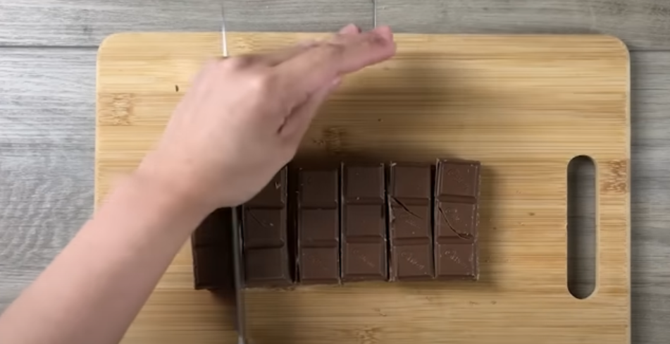 Roztapianie czekolady: Posiekaj 198 g czekolady mlecznej i włóż do miski żaroodpornej. Dodaj gorącą wodę, odstaw na 4-5 minut, a następnie mieszaj, aż uzyskasz gładką konsystencję. Odstaw do ostygnięcia.