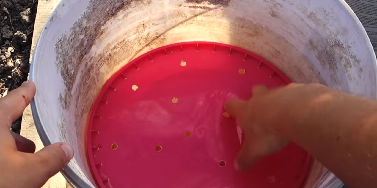 W plastikowej osłonie małego wiadra wykonaj około 15 otworów, za pomocą wiertła 8 lub 10. Średnica pokrywy powinna mieć taką wielkość, żeby spoczywała stabilnie w małym wiadrze.