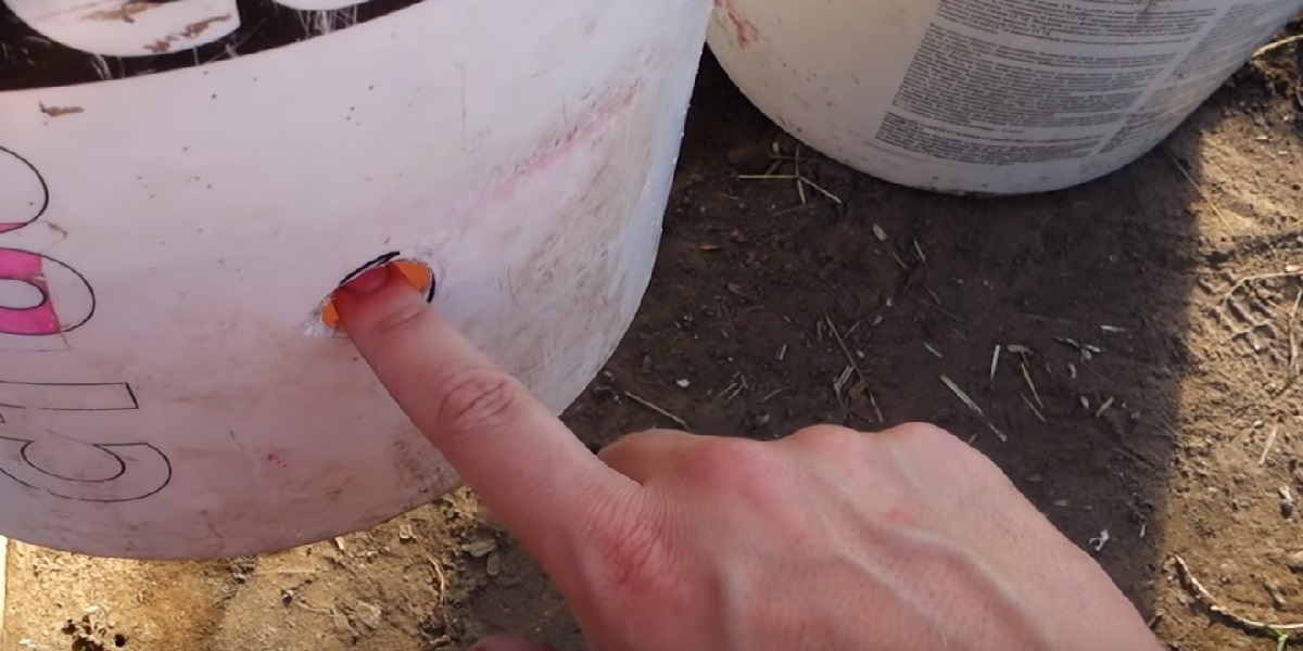 Odrobinę poniżej poziomu, na którym znajduje się pokrywka, wykonaj otwór. Średnica otworu powinna przypominać rozmiarem szyjkę plastikowej butelki lub standardowej konewki.