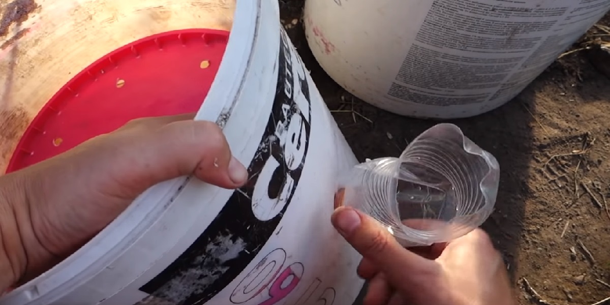 Przygotuj dwa wiadra – jedno o objętości 20 litrów, a drugie mniejsze o objętości 5 litrów. Zacznij od wycięcia dna z mniejszego wiadra. Jego wysokość powinna być nieco mniejsza, niż połowa wysokości większego wiadra. Na ścianach wywierć 3 albo 4 otwory, w przypadkowych miejscach i umieść je w środku dużego wiadra.