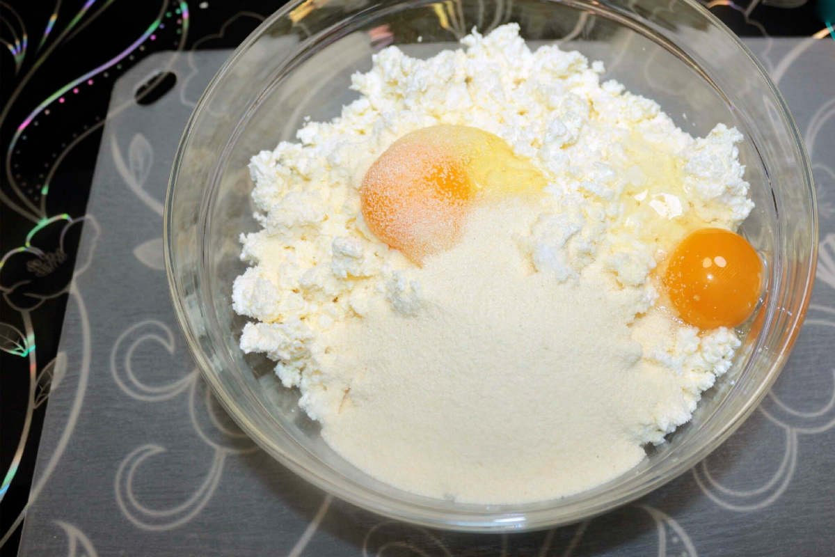 Gdy twaróg będzie już gotowy, dodaj do miski jajka, cukier waniliowy i kaszę mannę. Wymieszaj wszystkie składniki razem. Pozostaw ciasto do wyrośnięcia na 5-10 minut.