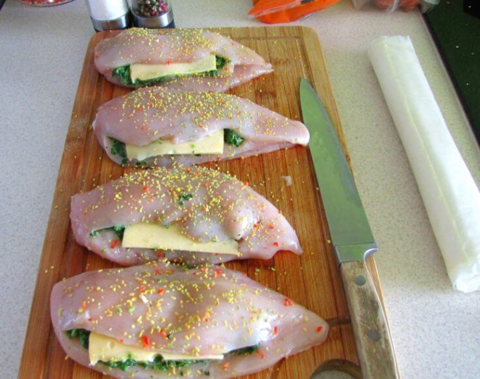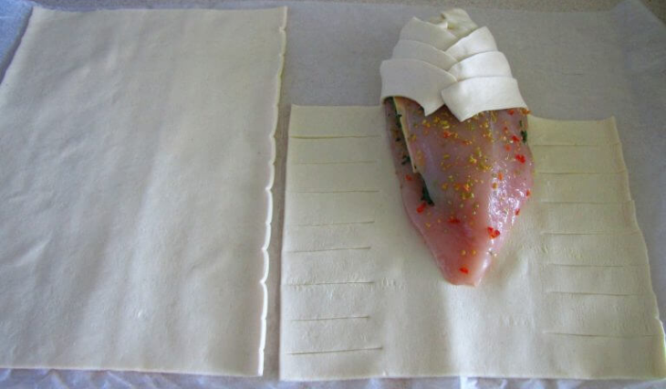Każde z ciast francuskich podzielić na 2 części, z obu stron naciąć paski grube na 2 cm, zależnie od grubości piersi. Na ciasto położyć pierś i zawinąć wyciętymi paskami „na zamek”, aby oblepiało mięso z każdej strony.