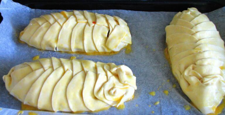 Zawinięte porcje umieścić na papierze do pieczenia, wysmarować rozbitym jajkiem i piec w temperaturze 200 stopni C, przez 40 minut na środkowej półce.